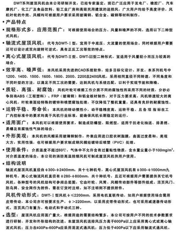 1、HTF型消防高溫排煙風(fēng)機 2、HTF(PYSWF)型高溫排煙混流風(fēng)機 3、HTFC消防通風(fēng)兩用柜式離心風(fēng)機 二、混流通風(fēng)機系列 1、SWF(HLF)型混流通風(fēng)機 2、SWF-IV(HL3-2A)型低噪聲節(jié)能混流通風(fēng)機 3、SWF-V(SJG)型斜流(混流)通風(fēng)機 4、HLF-6型低噪聲節(jié)能混流風(fēng)機箱 三、低噪聲軸流通風(fēng)機系列 1、T35-11(T40-11)型軸流通風(fēng)機 2、DZ型低噪聲軸流通風(fēng)機 3、DFBZ型壁式軸流通風(fēng)機 4、SDF型隧道式軸流通風(fēng)機 5、DWEX系列邊墻風(fēng)機 四、屋頂通風(fēng)機系列 1、DWT-I型軸流式屋頂風(fēng)機 2、DWT-II(III)型離心式屋頂風(fēng)機 3、DWT-IV型無動力屋頂風(fēng)機 4、RTC低噪聲離心式鋁制屋頂風(fēng)機 |